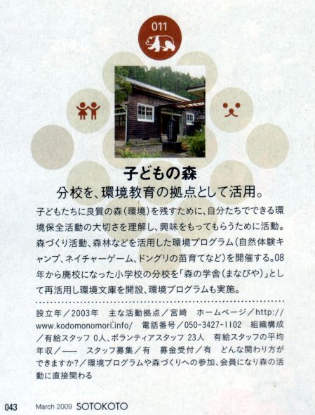 ロハスピープルのための快適生活マガジン『ソトコト』の特集(信頼の超保存版 LOVE&ボランティア2009!)で、子どもの森が紹介されました。『ソトコト』は、全国の書店で発売されています。『ソトコト』について詳しい知りたい方は、こちら から。