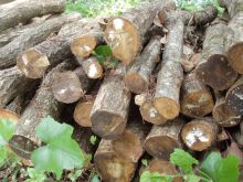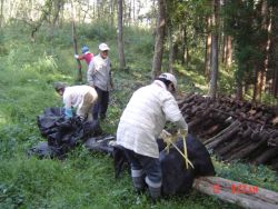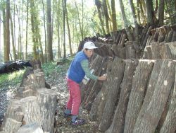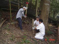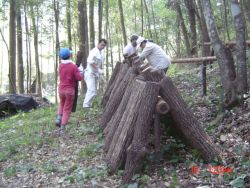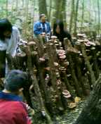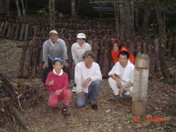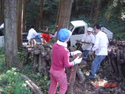 2005年2月に、椎茸菌の接種をして本伏せ状態にしてあるほだ木は、この秋に椎茸が発生し収穫ができるため、ほだ木起こしをしました。参加者は、会員4人と会員外サポータ4人の8人でした。