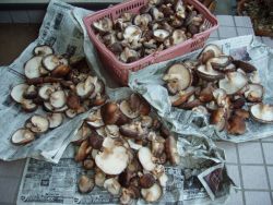 | 椎茸が、凄く発生していました。おそらく先日の雨の後に、気温が上がったからだと思いますが、昨年よりかなり遅めの大量発生です。昨日の「森林の再生活動」が終わって、参加してくれた方と一緒に椎茸を収穫しましたが、採りきれず今日も収穫を行いました。 収穫した椎茸は、会員宅に順じ届けています。 |