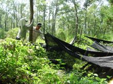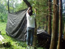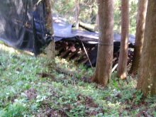 五十鈴小学校での本伏せ組みが終わり、小学校のグランド端でお弁当を食べた後に、子どもの森で管理している2004年度(1年前)に椎茸菌を接種したほだ木の本伏せをメンテナンスしました。 遮光シートは捲りあがり直射日光が当たり、草がかなり伸びていて風通しが悪い状態になっていました。