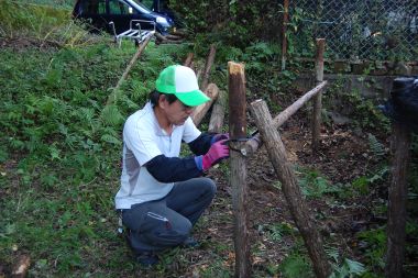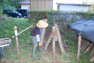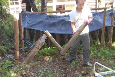 | ほだ木を並べる支柱を組みます | ほだ木を並べていきます |