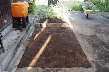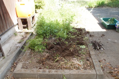 教室棟と管理棟の間(中庭)に花壇があります。教室棟と管理棟の間の空間は、よく使う空間なので、もう少し広さが欲しいと前から思っていましたので、おもいきって花壇を小さくしてみました。土を減らしブロックをはずして、元花壇だった一部を周りと同じ高さにしました。作業時間は後片付けも含めて4時間かかりました。