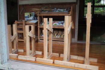 9月15日に開催するエコフェスタのための森の学舎整備をはじめました。エコフェスタでブースとして使用する管理棟の部屋を整理するための棚と、教室棟と管理棟を靴を履かずに移動できる竹の渡り板を作りました。他に、写真等パネル展示用イーゼルを3個作りました。イーゼルはたくさん必要となるので、活動の合間に少しづつ作っていきます。
