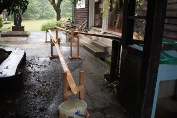 活動の後のお楽しみ素麺流しは、今年からは流し方を変えます。昨年度までは、まっすぐにグランド方向に流していましたが、途中で折り返すことにします。竹レールは、昨日伐竹して竹イカダには太すぎる部分を使います。