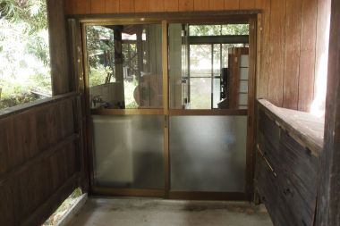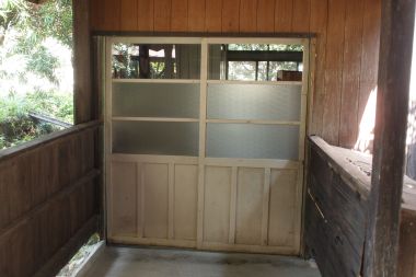 森の学舎が分校だった平成5年に、管理棟の大改修がおこなわれています。改修前はどのような姿だったのかは、写真等記録が残っていないため不明ですが、アルミサッシの窓や出入口は、木製であったであろうと思われます。分校が廃校となり、子どもの森に建物が譲与された当時に、外倉庫(現在石釜小屋)に木製の出入口戸が一組残っていました。その出入口戸を6年間大事に保管していました。戸の形状から管理棟のトイレ出入口の戸だったのではないかと思い交換したいと以前から考えていました。エコフェスタが終わったところで、思い切って交換しました。アルミサッシの枠をはずしてみると、さいわい鴨居が残っていて、戸車の交換と内鍵の交換を行ってから、アルミサッシの敷居下のセメントを削りながら間口の高さを調整し、木製の出入口戸をはめることができました。