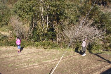 午前中は、11月のecoスクールで播いた麦から発芽した苗を、ecoスクール生2名が麦踏みをしました。麦踏みは、霜柱によって浮き上がった土を押さえ、麦根張りをよくするために行ないます。踏まれ傷つくことで、エチレン(植物のホルモン)が発生して茎が太くなり、病気に強く風で倒れにくい強い麦になります。