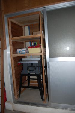 @ トイレ入り口付近に置いてあるテーブルソーがトイレ空間を狭くしていたので、テーブルソーが格納できて上段に小物を置くことができる棚を作りました。