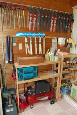 玄関に道具等を置いていますが、道具が増えて道具整理棚が煩雑になってきたので、チェーンソーを校舎倉庫に移動して空いた空間にコンプレッサーと道具を格納できる棚を作りました。また、壁に鎌を掛けるバーを設置して、玄関をすっきりさせました。