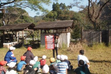 昨年に引き続き、門川町教育振興研修会による子供たちの五感で感じる自然体験がおこなわれました。門川町内の小学校と中学校から約30人の子供たちと先生が参加して、昨年と同じようにネイチャーゲームと豚汁つくりを楽しみました。ネイチャーゲームは、フェニックス宮崎シャアリング・ネイチャーの会のリーダー2名がやってきました。子どもの森は、森の学舎の開放と豚汁作りでの簡易釜戸2台と鍋、調理道具の貸与で協力をしました。天気予報は雨でしたが、晴天で暖かい一日となり、子どもたちは自然体験を満喫できたようです。