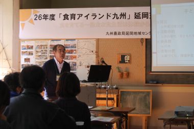 九州農政局延岡地域センター主催の「平成26年度食育アイランド九州延岡交流会」が森の学舎で開催されました。例年は、街中の公共施設で開催していたのですが、食育に取り組んでいる団体の現場近くで開催したいと要望があったそうです。子どもの森が、四季をまるごと体験ecoスクールで小麦作りをしているのが、間接的ですが食育の活動の一環であるとのことで、森の学舎で開催したいと九州農政局延岡地域センターからの依頼を受けました。