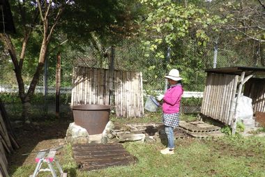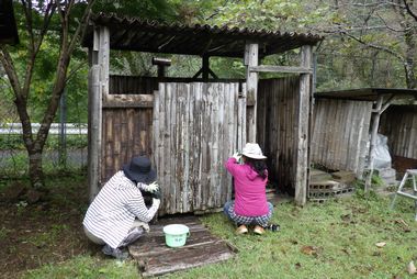 2号風呂小屋の杉柱根元と竹瓦が腐食し大変危険な状態となりました。そこで、建替えをすることになりました。今日は、旧小屋を撤去しました。新小屋設置は、順次進めて行きます。