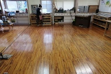 年末恒例の森の学舎大掃除を実施しました。今回は、教室棟の飾り棚とネイチャー工作材料棚の入れ替え・床磨き・窓掃除・仕切り壁磨きを行いました。