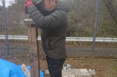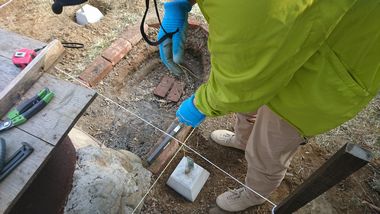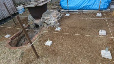 10月に撤去した風呂小屋跡から瓦礫を取り除いてから柱を立てるための束石を9個設置しました。束石は水平垂直に柱を立てる位置に正確に、時間をかけ慎重に設置していきました。ですので、今日はここまで、次回は柱と垂木に防腐剤を塗着していきます。風呂小屋の完成まで日数がかかりそうです。