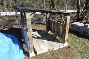 前の小屋は、丸太柱を直接地面に埋め込んでいましたが、今回の小屋は束石を置き、角の柱としました。束石は購入しましたが、他の材料はすべて廃材を使いました。