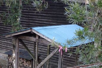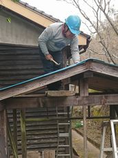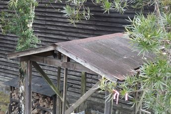 パン釜小屋のトタン屋根が錆だらけで穴が開き雨漏りで下地木の一部が腐っています。トタン屋根(波板10枚と屋根トップ5枚)をすべて新しい物と交換しました。