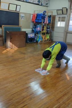 ほうきがけと雑巾がけを実施し、子どもたちが安心して活動できる環境を整えました。