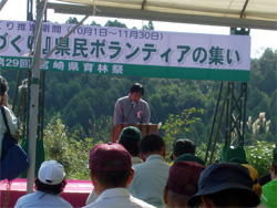 昨年に引き続き(昨年は「みやざき悠久の森づくり」県民が集う育林祭」)、森林づくりボランティアの集まりに参加しました。 しかし、今回の参加は特別です。横山理事長にて、子どもの森の活動発表がありました。 式典は、10時から1時間ありました。その中で、主催者・来賓者あいさつや、育林・緑化・学校関係緑化優秀校の功労者表彰、森林づくり決意宣言などが行われました。横山理事長の活動発表にあたえられた時間は、10分間でした。