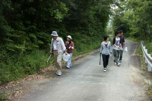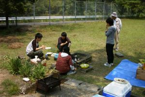 親睦会も兼ねた昼食は、グランドに特設バーベキュー台を設置して、魚干物・お肉・野菜でバーベキューをしました。また、ご飯は、飯盒で炊き上げ、薪は廃材を使いました。 散策(13:30〜14:10) 横山理事の案内で、森の学舎近辺をゴミ拾いを兼ねた散策を行いました。あまり時間がなかったので、予定していた神社までは行けませんでしたが、クサイチゴを摘んで食べたり、シライトソウの群生を見たりと楽しめました。