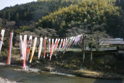 休日は、ほとんどが松瀬分校の室内掃除をしています。今日は、トイレ掃除をしようと思い分校に来たら、松瀬地区の方が鯉のぼりを五十鈴川に渡していました。この鯉のぼりは、5月まで泳いでいるそうです。 鯉のぼりの先に見えるのが分校です。