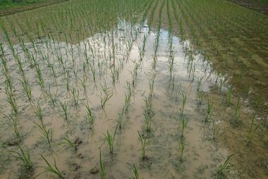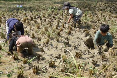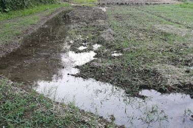 台風等の暴風で、稲が倒れ(完全には倒れて田んぼの水が抜けきれず、泥濘の中、裸足での稲刈りとなりました。