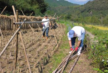 @はさ掛けの準備(奥には指導していただいてる地元農家さんのはさ掛け)