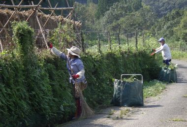 @畦の草刈り(田んぼの畦を歩き易くするための田に近い部分の草刈りと、周辺に生えてき竹の刈りとり)