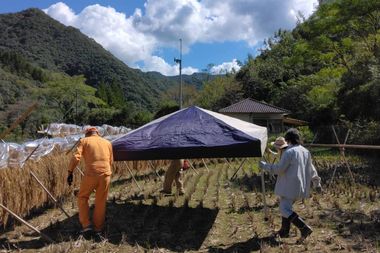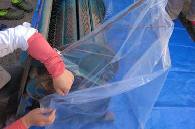 午後は、スタッフ5人が居残り、はさ掛けした稲の雨対策を施しました。