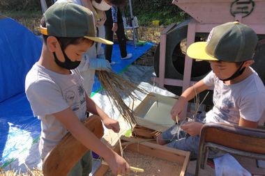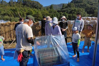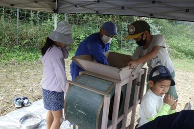今年は、脱穀機3台と唐箕を、はさ掛けをした田んぼに持ってきて実施しました。参加者が集合する前にスタッフで脱穀のセッティングを行いました。