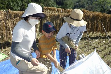 天気予報では、にわか雨でしたが、夕方までなんと雨が降りませんでした。数件の子どもたちの運動会もあって参加者が少なく、脱穀が午後4時までかかりました。スタッフの解散は、片付け後の午後5時30分でした。