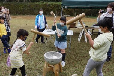 収穫祭をする午前中は、天気予報では雨でした。が、雨が降らず外で餅つきと餅まるめができました。もち米9kgを、6回に分けて、つきました。お昼前には、つきたての餅を、海苔・きな粉・大根おろし・あずき・甘栗と醤油・蜂蜜・ポン酢をあわせて食べることができました。