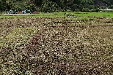 今年度復元する田んぼは、マイクロショベルカーで土を掘り、畦の土盛を実施してから管理機で耕うん、その後表面をレーキで平らに整地しました。