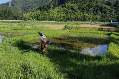 7月7日の田んぼ内の草取りのために、田んぼ畔と周辺の草刈りを実施し、田んぼ周辺をスッキリときれいにしました。