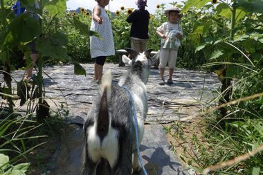 今日のおまけは、田んぼの近くのヒマワリ畑で、「そらいろのたね」のヤギと一緒にヒマワリの花摘みでした。