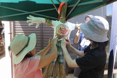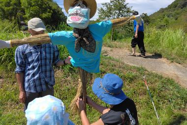 12時30分から案山子作りを開始しました。案山子祭り等で見かけるリアル案山子でなく、昔ながらの案山子を作りました。約1時間位で、7体の案山子が完成し、田んぼ周辺に立てました。稲刈りまで、案山子に田んぼの見守りをしてもらうことになります。