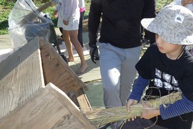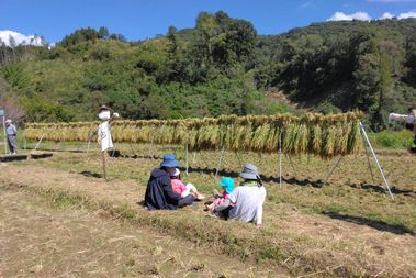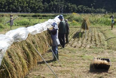 おやつ終了後、稲架かけした稲を雨から守るためのマルチシートを掛けます。風に飛ばされないようにしっかり止めたて終了です。そして3週間後の11月3日の脱穀を待ちます。