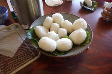 しら餅は、醤油と海苔、きな粉、大根おろしをトッピングしました。他に、餡子もち、芋もちも作りました。白玉団子と餡子・バナナ・キューイでスイートも作り食べました。