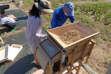 虫を取り除くため、脱穀後振るいをかけ、唐箕後にもう一度ふるいをかけて、虫を排除しました。