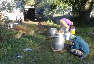 スタッフは、1時間30分前に集合して、臼と杵の準備・簡易かまどの設置をして、お湯を沸かします。参加者が集まったらすぐに餅つきができるように、もち米を蒸していきます。